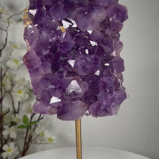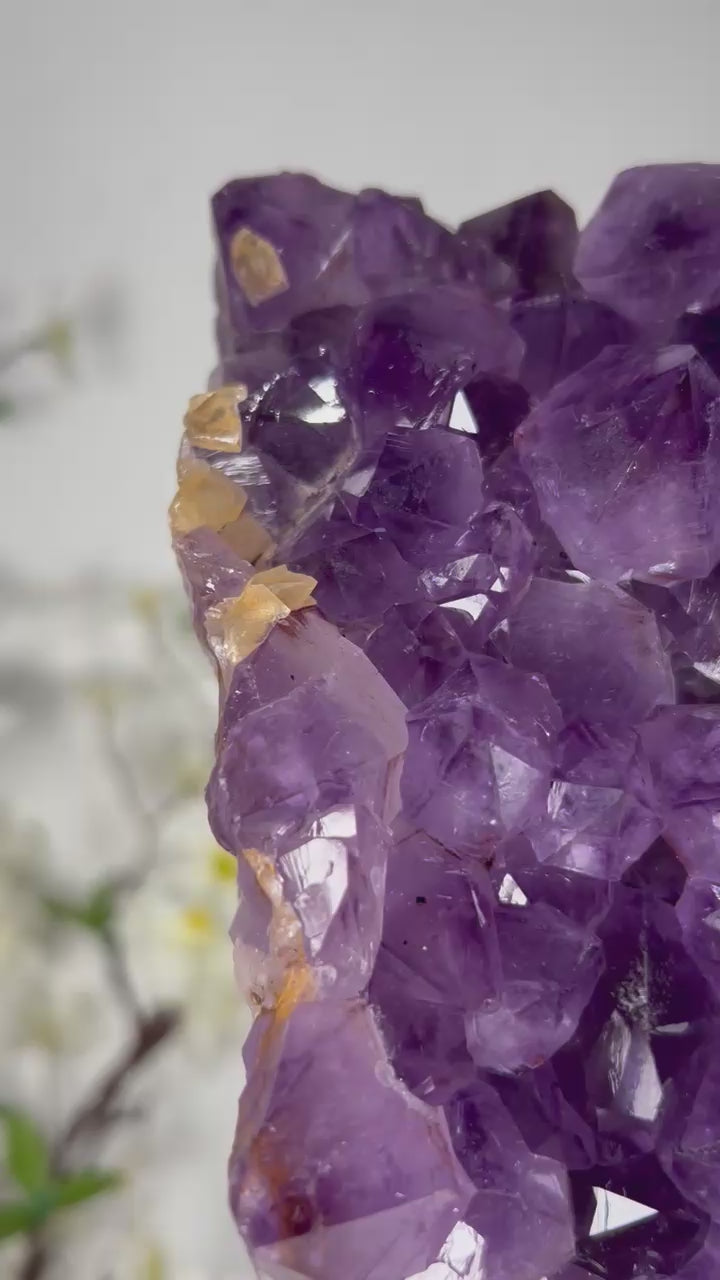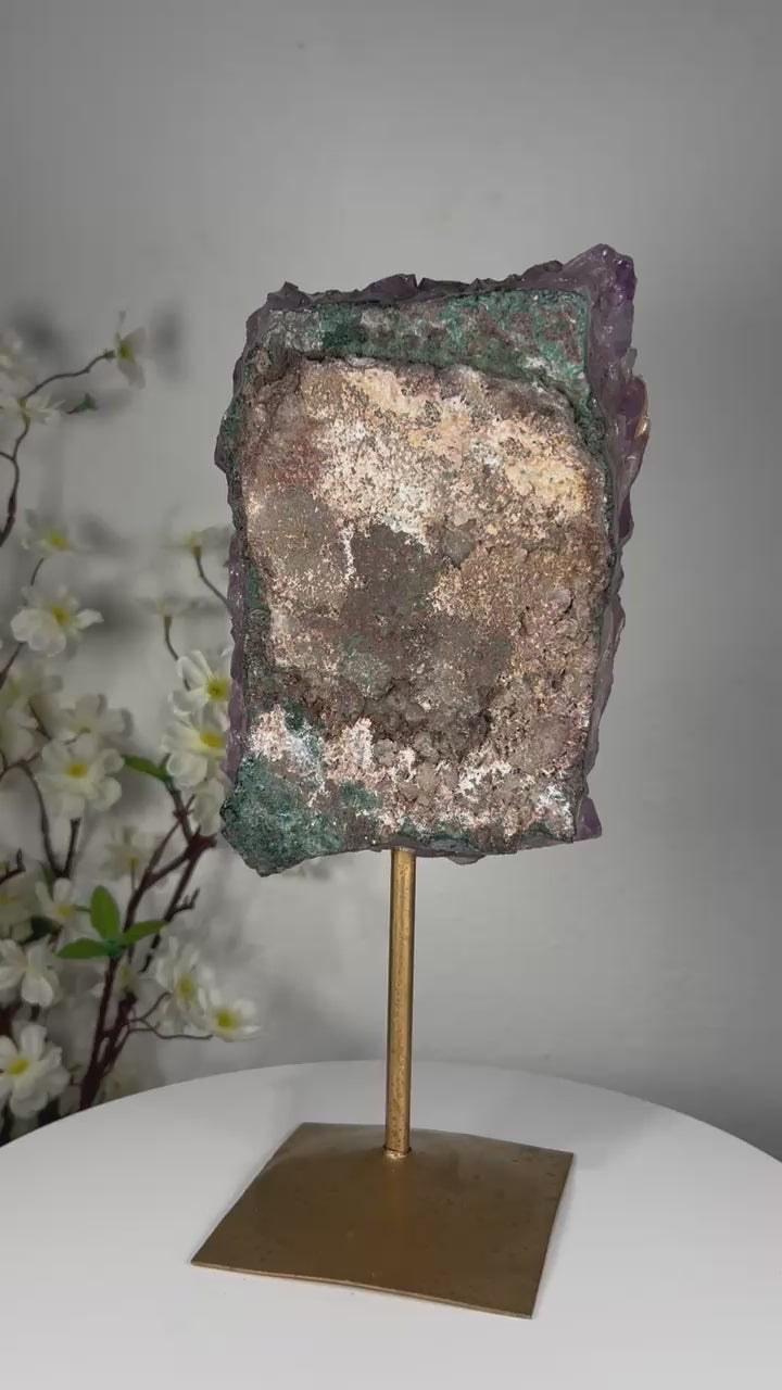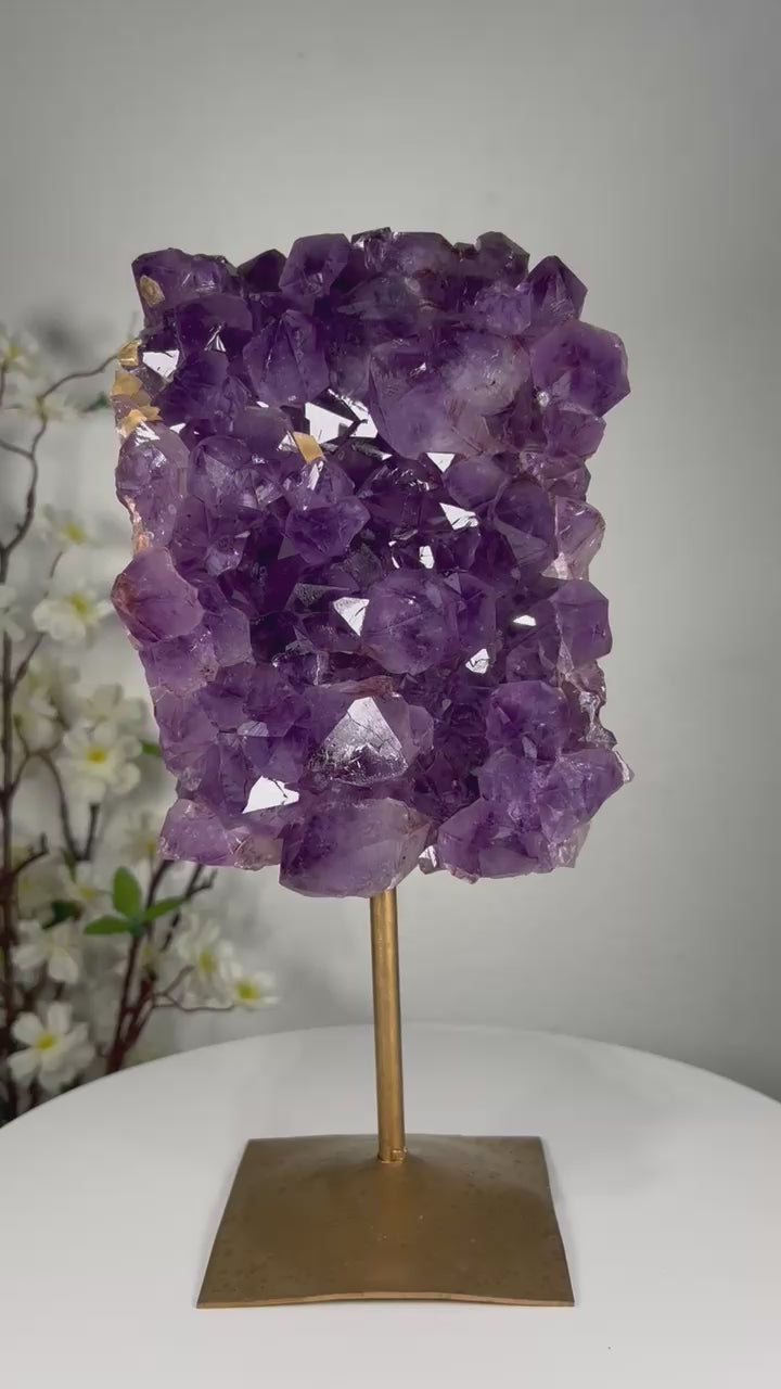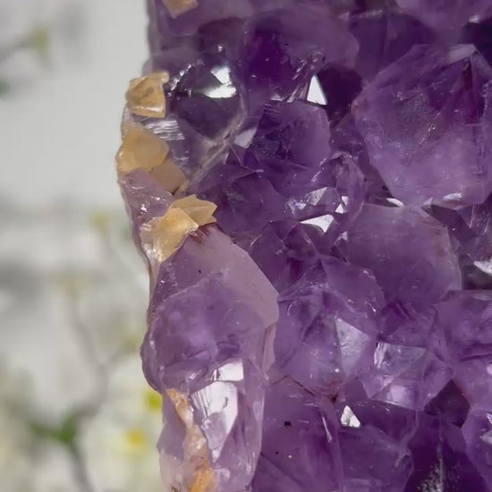 Golden rutile needles shimmer inside the violet amethyst, creating a breathtaking display of light and movement that elevates any environment with clarity, intention, and high vibration.