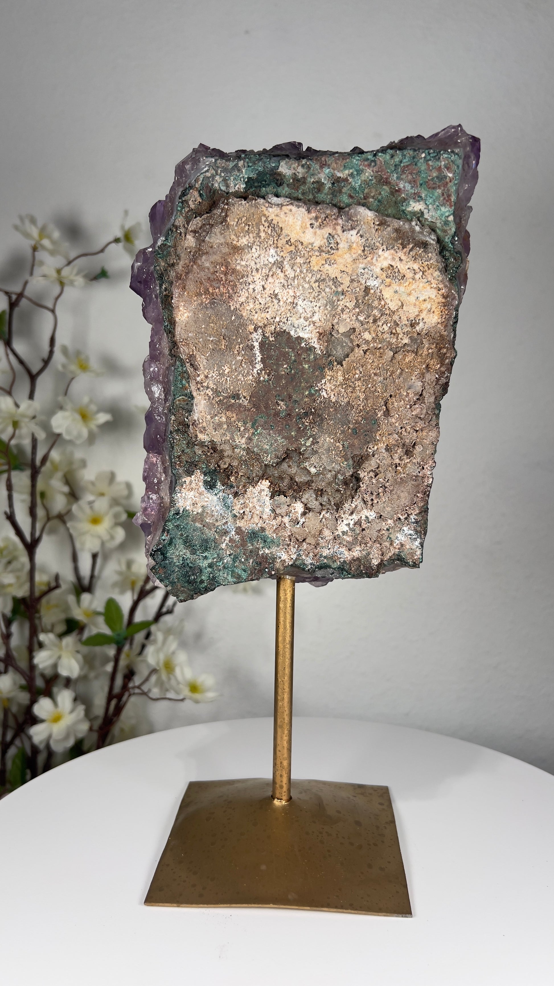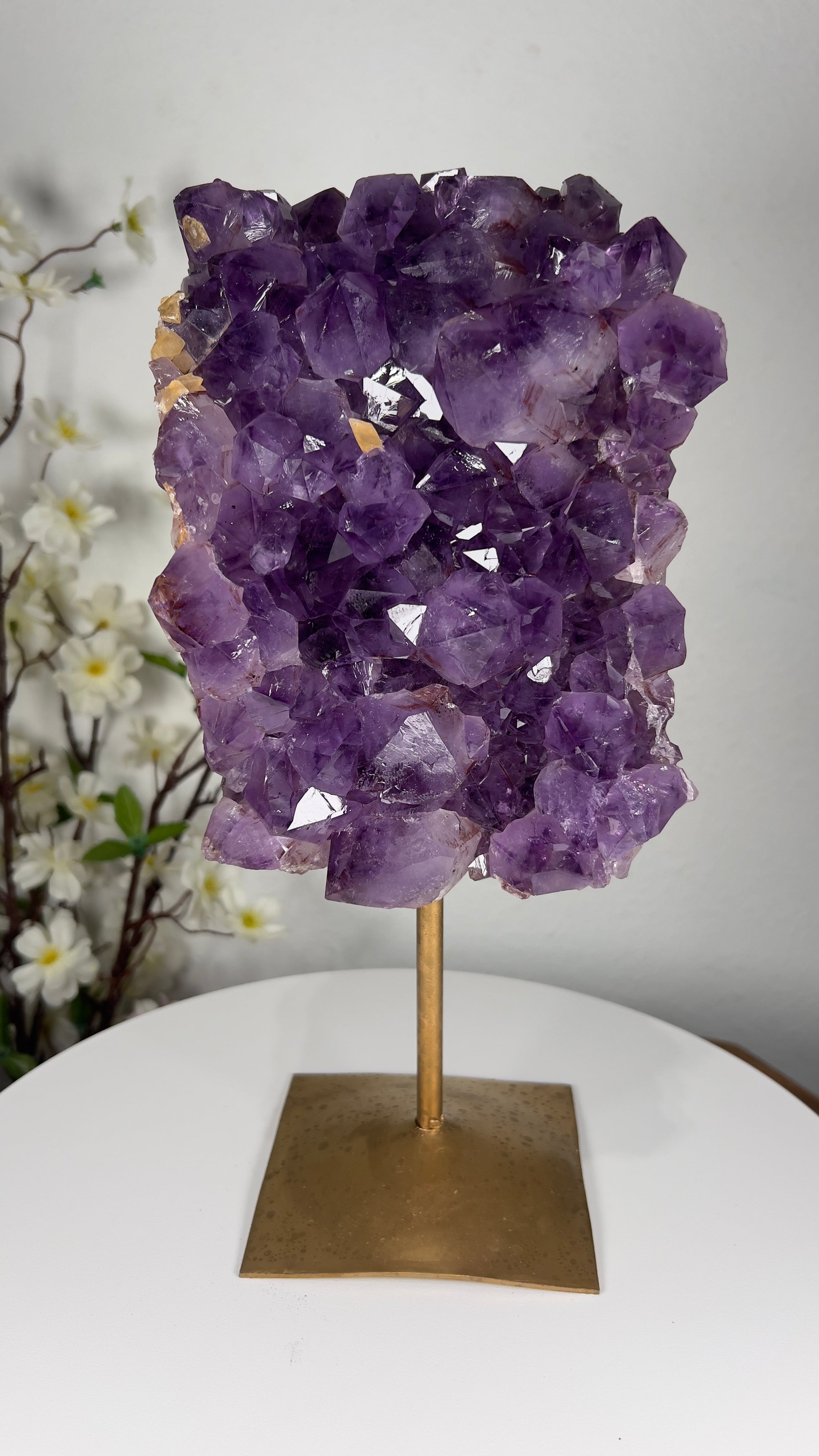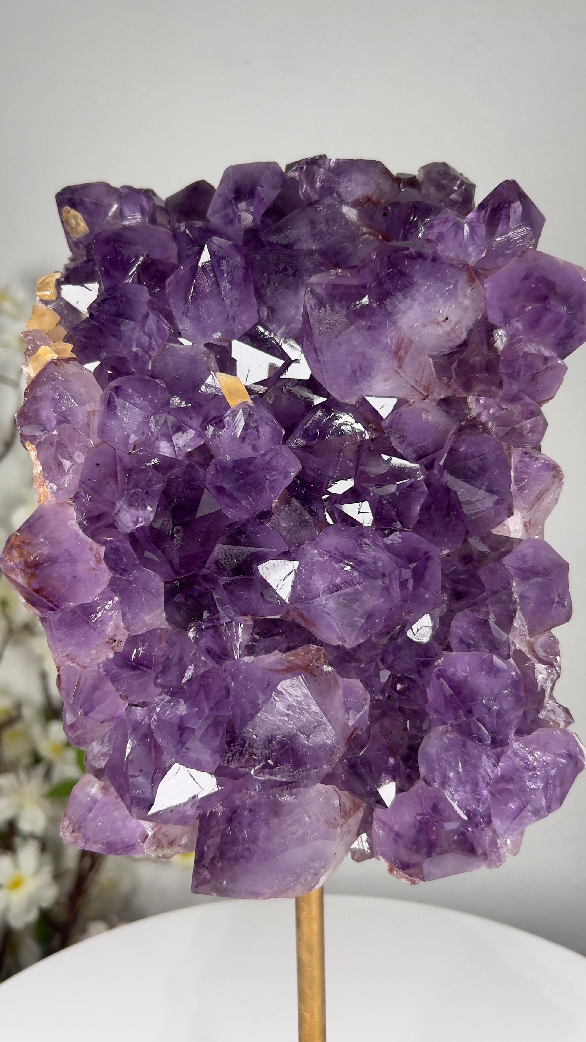 Golden rutile needles shimmer inside the violet amethyst, creating a breathtaking display of light and movement that elevates any environment with clarity, intention, and high vibration.